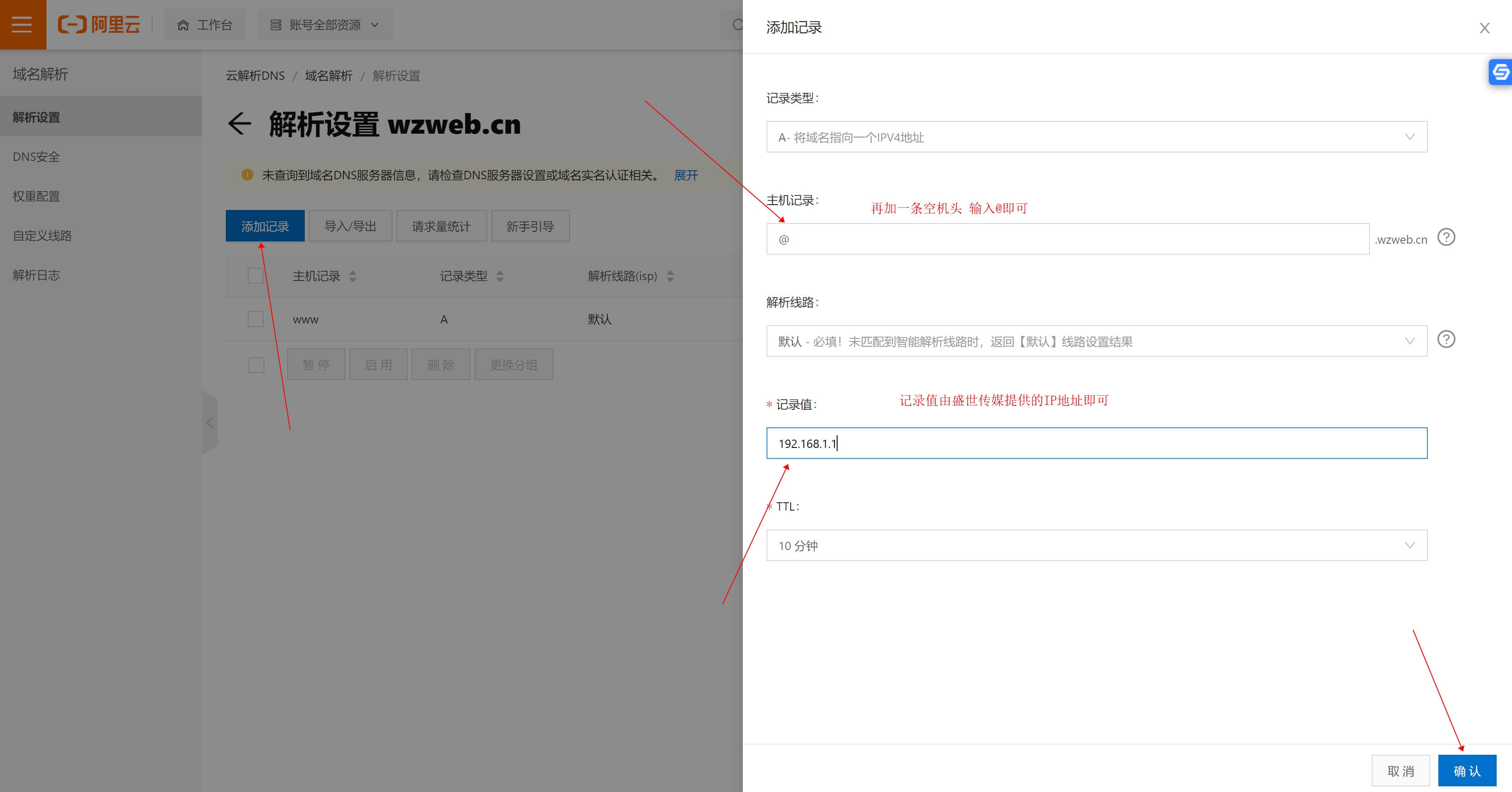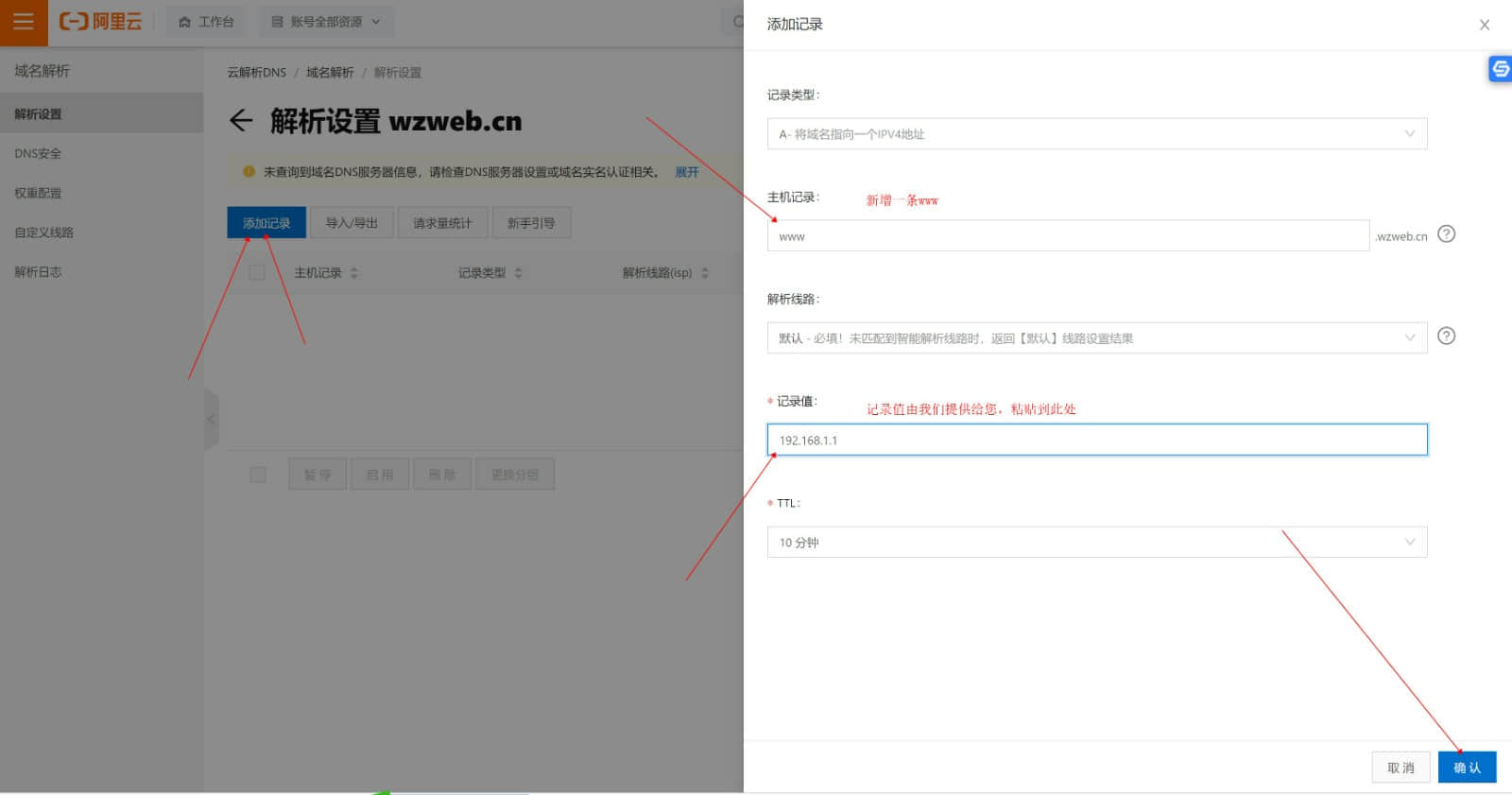 2.輸入主機記錄www ,記錄值由我們提供給您的,粘貼到記錄值此處,確認即可。