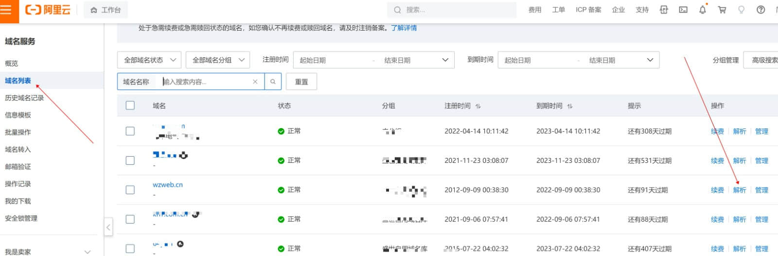 1.在阿里云域名列表找到自己要解析的域名,點擊右側對應的解析