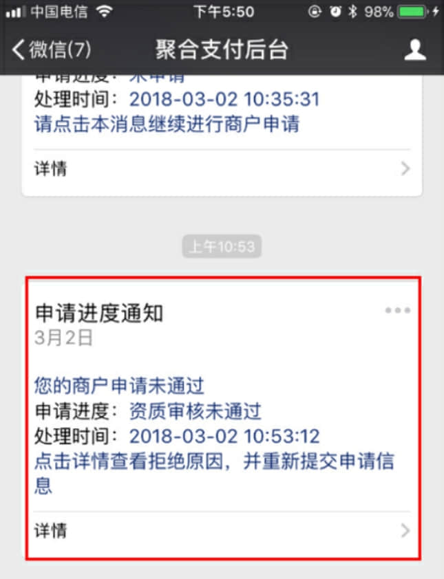若未審核通過,點擊詳情查看未審核通過原因,重新更改提交資料。